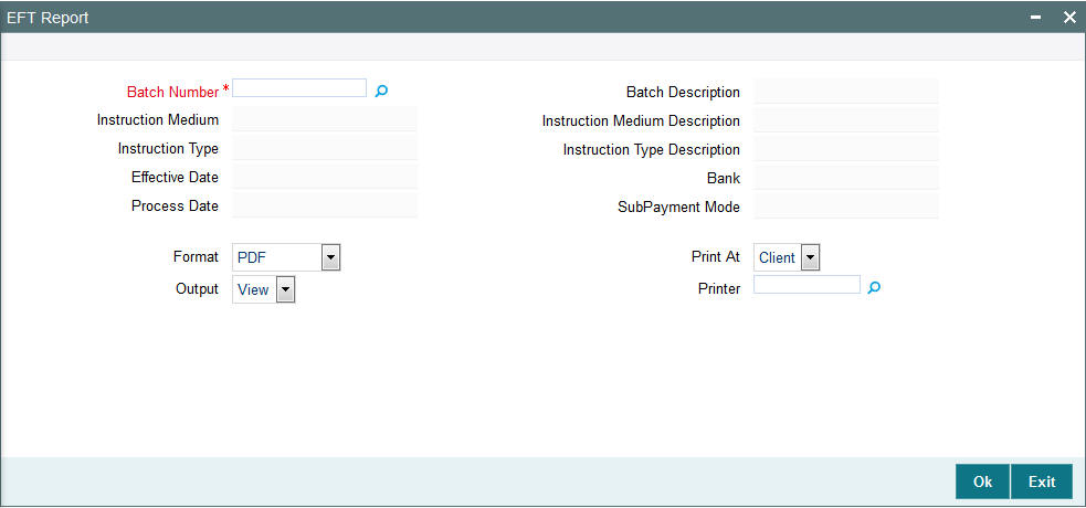 You can generate EFT report using ‘EFT Report’ screen. You can invoke this screen by typing ‘UTR00321’ in the field at the top right corner of the Application tool bar and clicking on the adjoining arrow button.