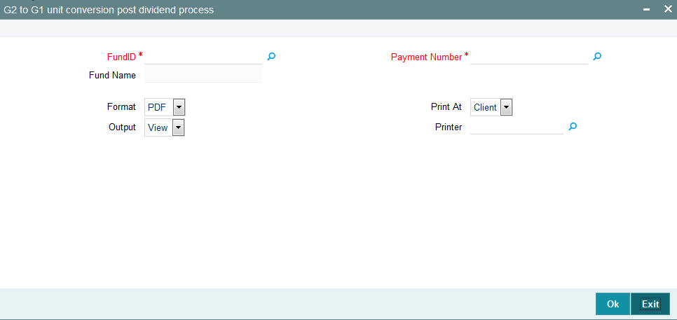 The ‘G2 -G1 Unit Conversion Post Dividend Process’ screen allows you to enter the search criteria for the generation of a G2-G1 Unit Conversion Post Dividend report. You can invoke this screen by typing ‘’UTRDG1G2’ in the field at the top right corner of the application tool bar and clicking on the adjoining arrow button.