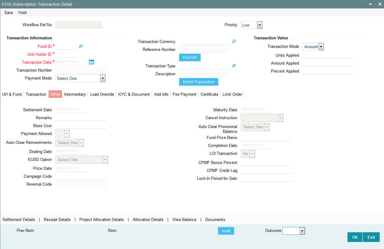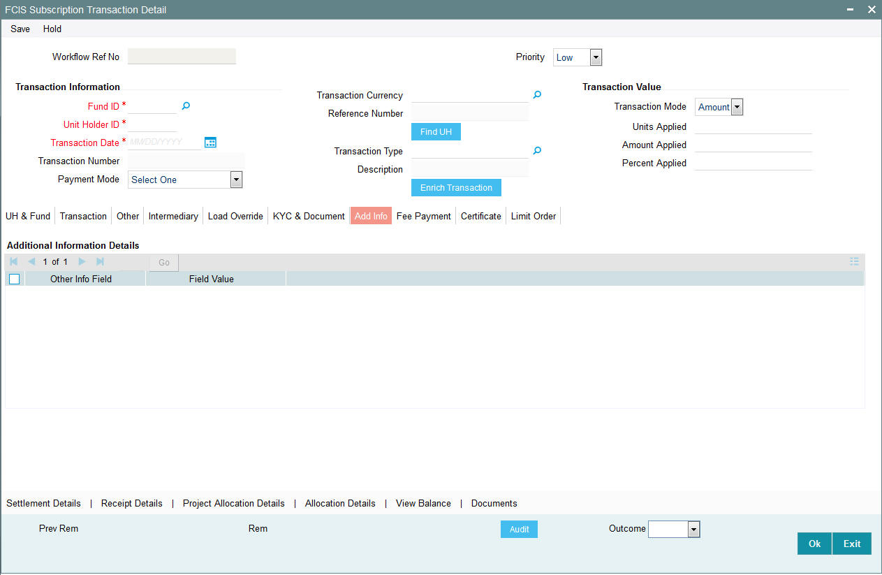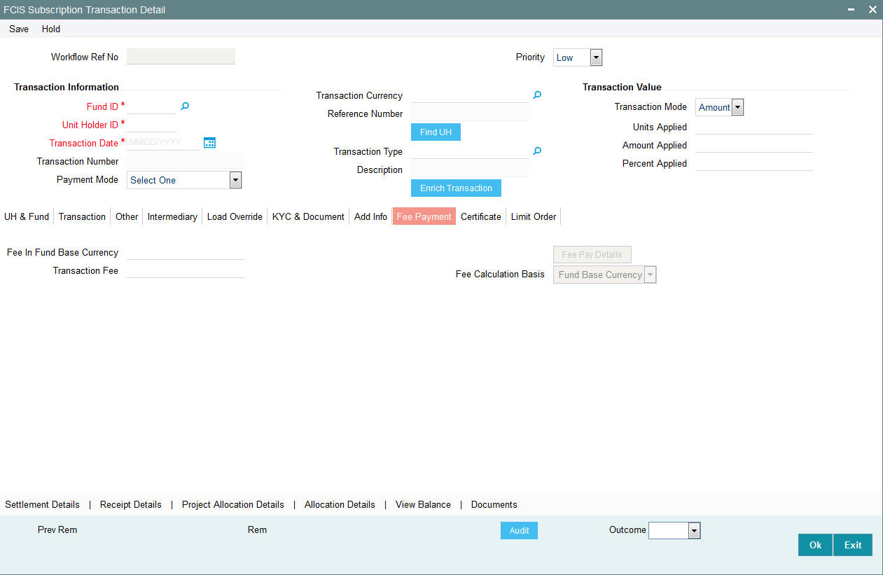 Once you have entered all the details of the transaction click on Enrich Transaction. The relevant details of the transaction are defaulted in the UH and Fund Section.