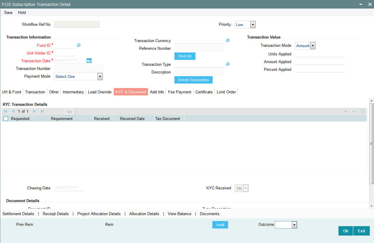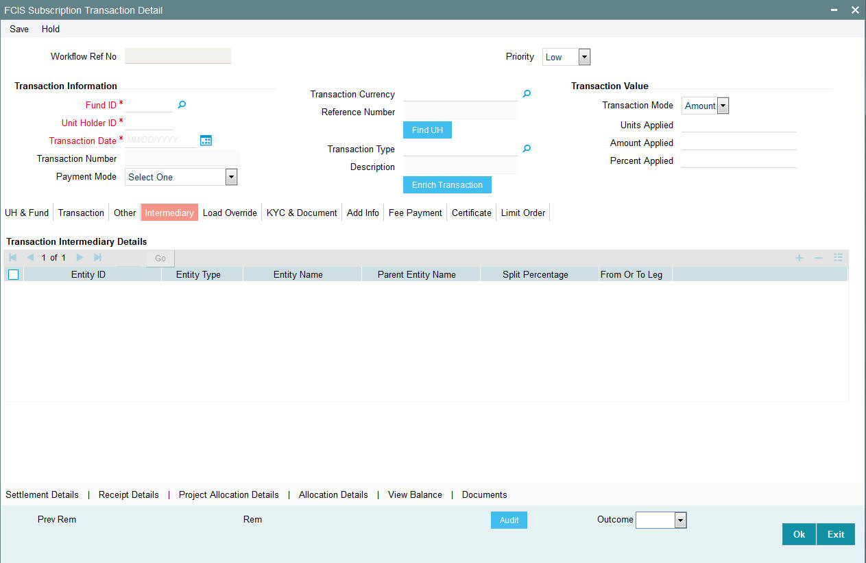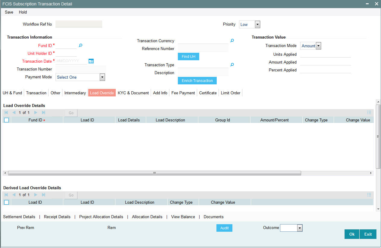 Once you have entered all the details of the transaction click on Enrich Transaction. The relevant details of the transaction are defaulted in the UH and Fund Section.