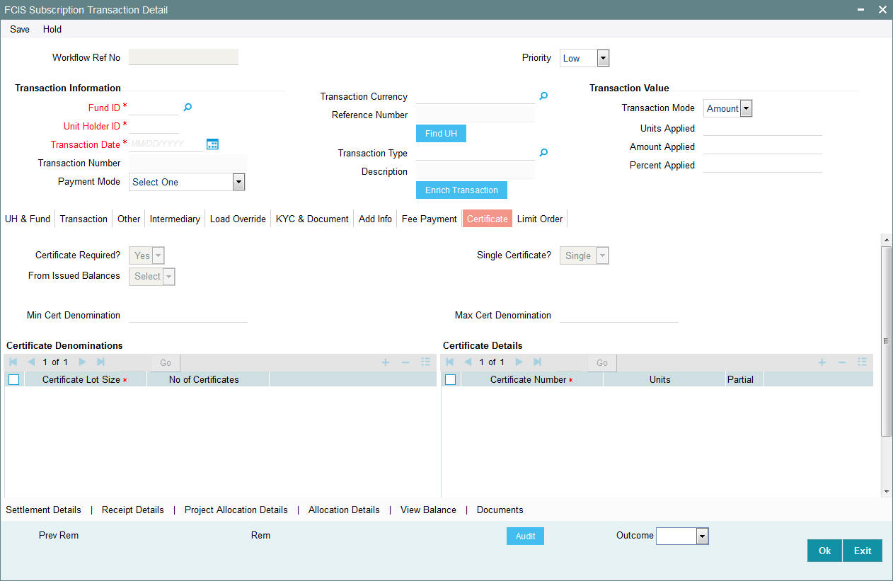 If you have selected a certificate option fund, then all certificate information fields are enabled. You can enter the following details: