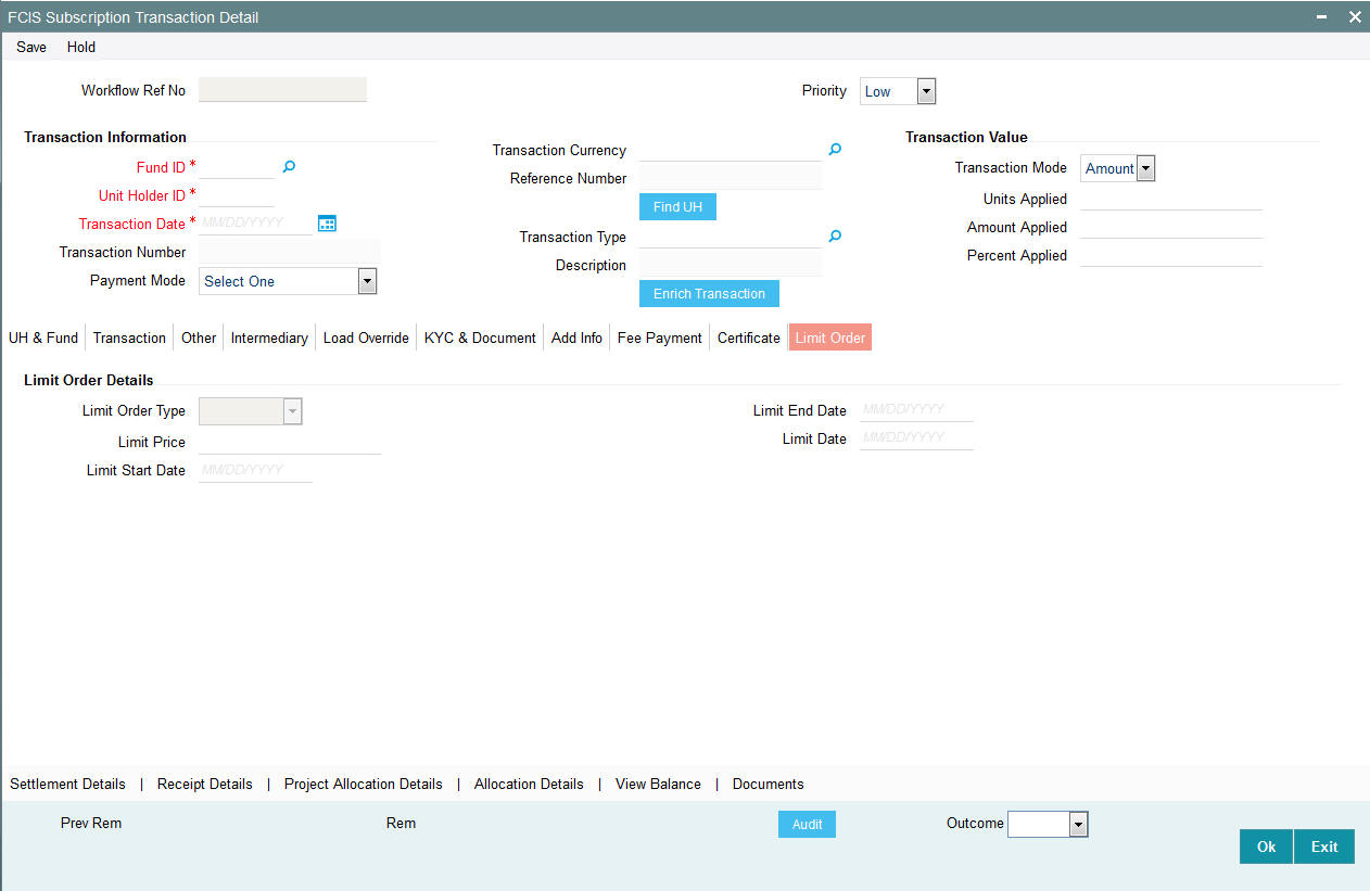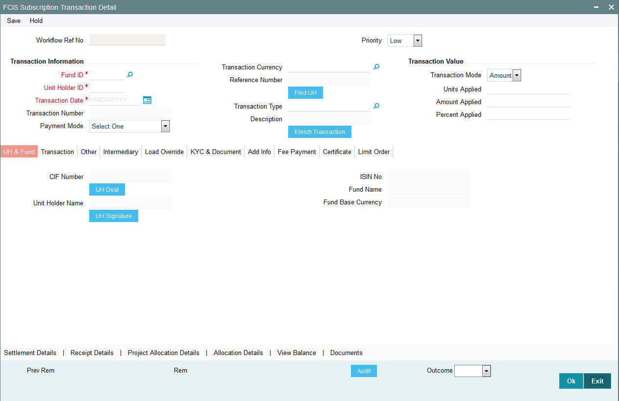 From the find UH button, specify the CIF Number and then choose the required unit holder in the Unit Holder field, or else specify the ID of the unit holder in the Unit Holder field. You must select a CIF or unit holder that is not restricted (or does not belong to a restricted category) for the fund into which the transaction is being entered. If not, the system does not allow the transaction to be saved.