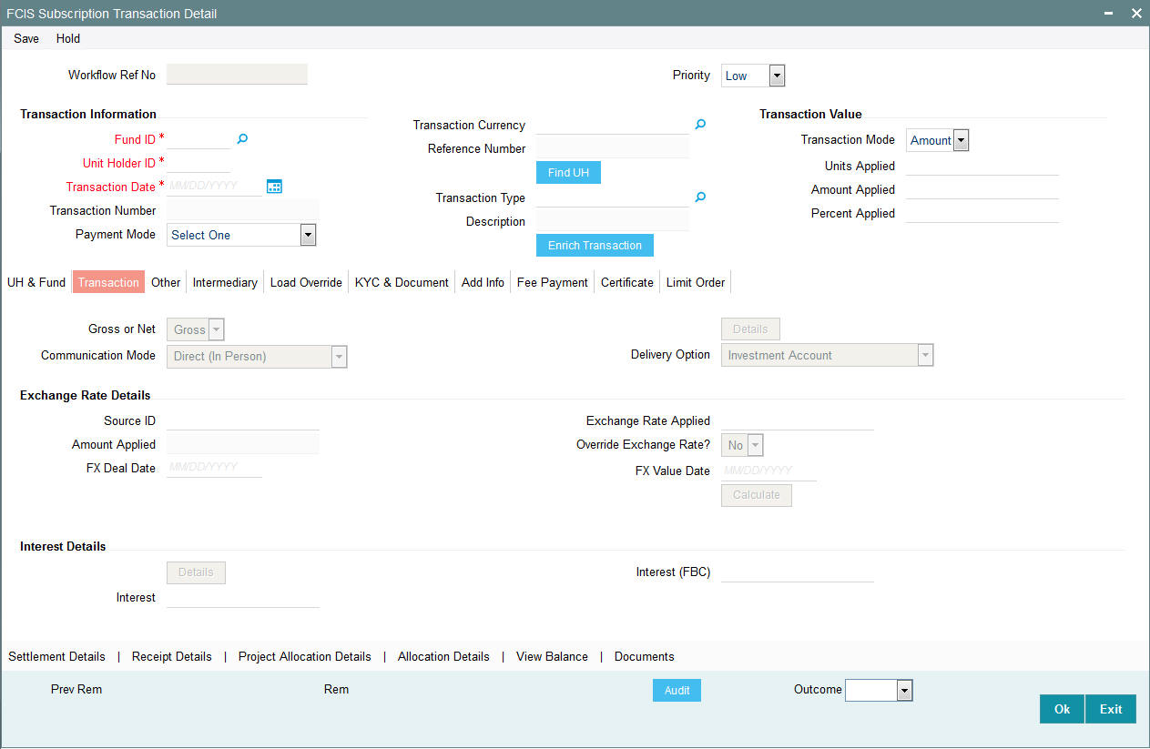 The system will display the ‘FX Deal Date’ during transaction enrichment for subscription, transactions, which you can override if required. However, if the date you specify is lesser than the application date or greater than the FX Value Date, the system will display an error message. The date should also be a TBC working day.