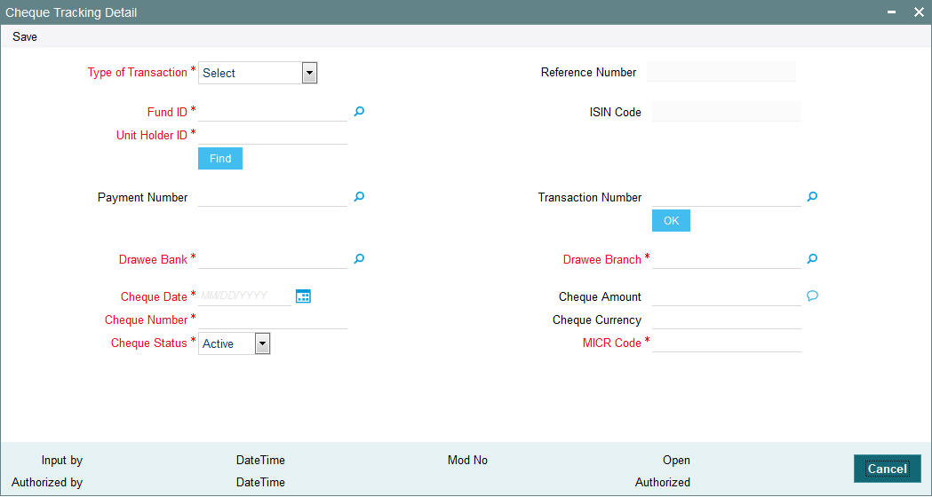 When you enter a transaction request from an investor into the system (in the Transaction Details screens), you can save the transaction without entering any details of payment, in either of the following cases: