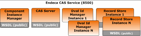 The CAS Service is a servlet container that runs the CAS Server, the Component Instance Manager, any number of Dimension Value Id Managers (one per application), and any number of Record Store instances (one per data source).