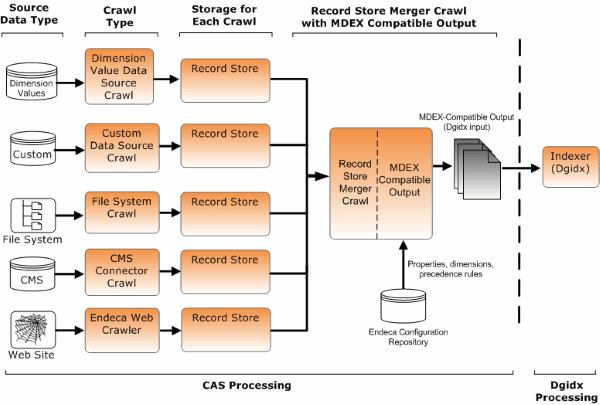 Although you can create a crawl of any data source type, the most common scenario is to create a Record Store Merger crawl that is configured to write MDEX-compatible output. The advantage of this type of crawl configuration is the capability to merge many types of data and then write output that can be directly processed by Dgidx without using Forge. For example, this data can include product inventory, product descriptions, extended product reviews, and so on.