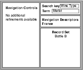 The Wine Type dimension is omitted from the navigation controls because all of the records in the current record set are tagged with Merlot, and Merlot is a leaf dimension value that cannot be further refined. In other words, the Wine Type dimension no longer needs to be displayed because there are no refinement values left to pick from it.