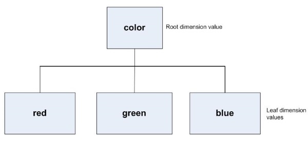 Flat dimensions are suitable when no parent-child relationships would normally exist between the dimension values. For example, dimension values named "Blue" and "Green" cannot logically be in a parent-child relationship; colors are not parents of each other in any ordinary sense. Thus, dimension values such as "Red", "Green", and "Blue" could be added to a flat dimension named "Color", as shown in the following diagram:
