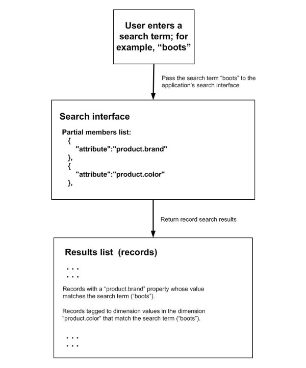 The following diagram illustrates how a search interface selects the records that appear in the results list, given a particular search term ("boots") entered by the user: