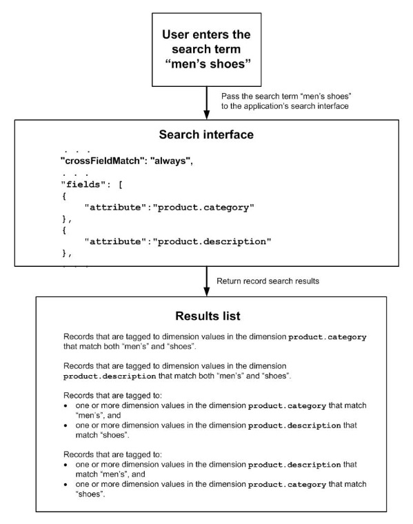 Specifies whether parts of a search term can be individually matched with different members; for example, given the search term "red shoes", can matches be made between "red" and one member, and between "shoes" and another member? Cross field matches can be made between dimensions, between properties, or between dimensions and properties. |