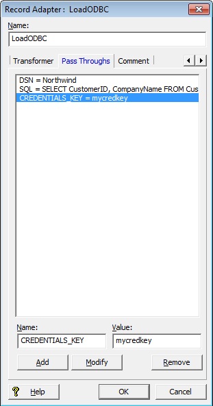 In addition, if the connection requires properties (such as a password or username), then the following attribute can also be specified, as many times as necessary, on the Pass Throughs tab: