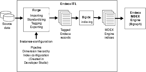 Forge and Dgidx use an instance configuration to accomplish their tasks. An instance configuration includes a pipeline, a dimension hierarchy, and an index configuration.