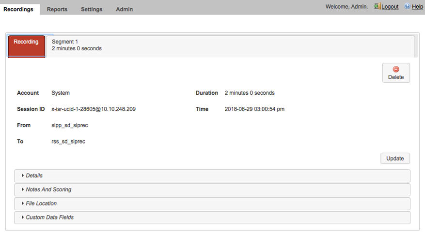 The ISR allows you to assign specific information to each recording that can be used to identify and analyze calls. You can save this information to be reviewed at a later time. You can display the additional details and add specific information about a recording by clicking Details on the Recording Details page.