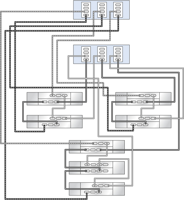 그림 489 클러스터형 ZS4-4 컨트롤러의 HBA 3개가 DE3-24(아래쪽 체인, 두번째 Disk Shelf) 1개와 DE2-24 6개에 3줄 체인으로 연결됨