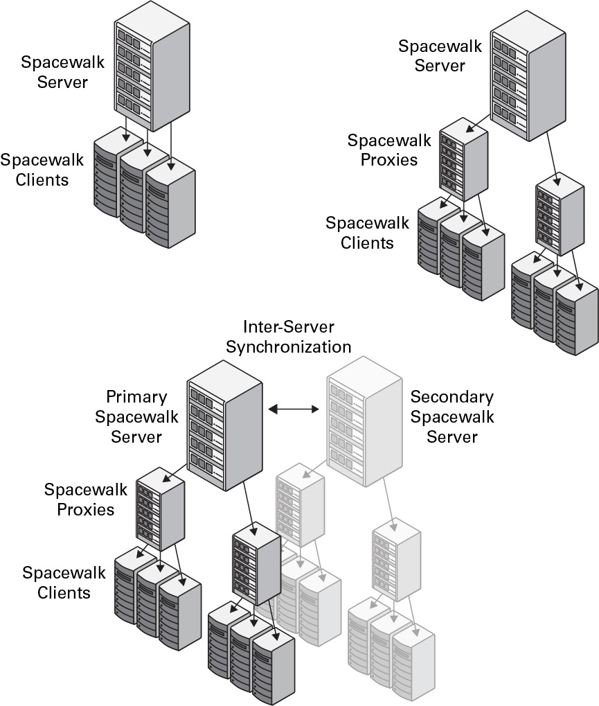 たとえば、単純なデプロイメントには、クライアント・システムのプールを提供する単一のマスター・サーバーまたはプライマリ・サーバーと、さらに多くのクライアント・システムをサポートできるようにプライマリ・サーバーから処理をオフロードするプロキシ・サーバーがあります。 大規模なデプロイメントでは、複数のSpacewalkプライマリ・サーバーとプロキシ・サーバーを構成して、プロビジョニングとソフトウェアのダウンロード速度を高速化できます。 分散構成では、クライアントは、近接しているサーバーへのネットワーク帯域幅アクセスが高い可能性があります。