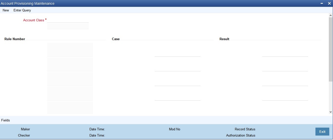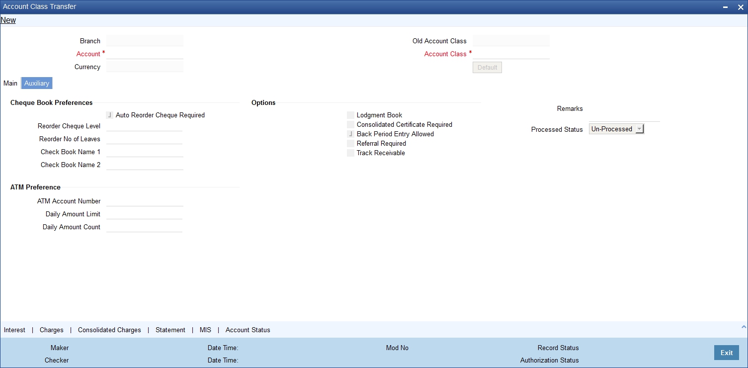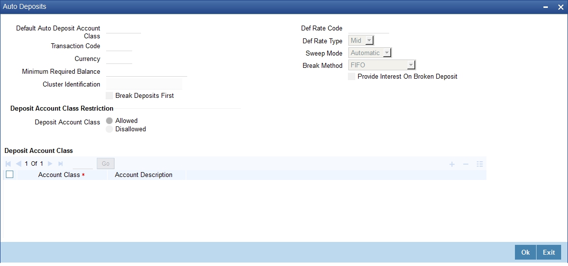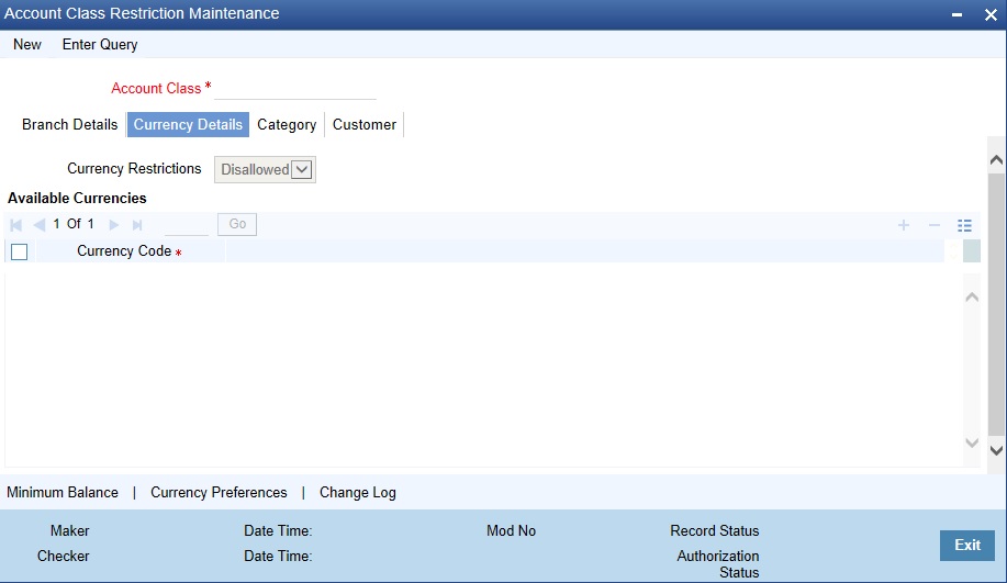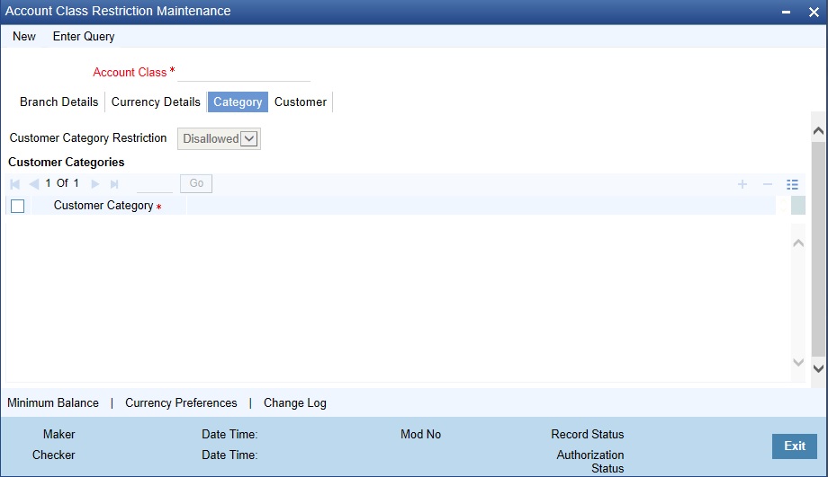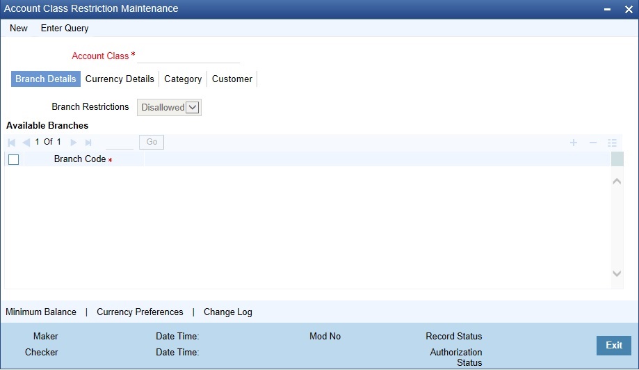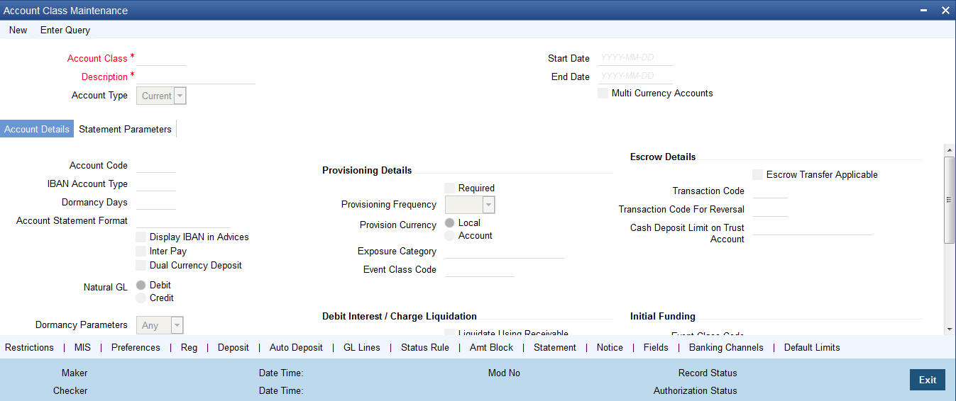 Each group is referred to as an Account Class and is maintained in the ‘Account Class’ screen. For each class, you also define certain common attributes applicable to all accounts in this class, such as, the General Ledger lines to which the accounts in this class report to, facilities granted to the account holders (pass book, check book, ATM etc.).
