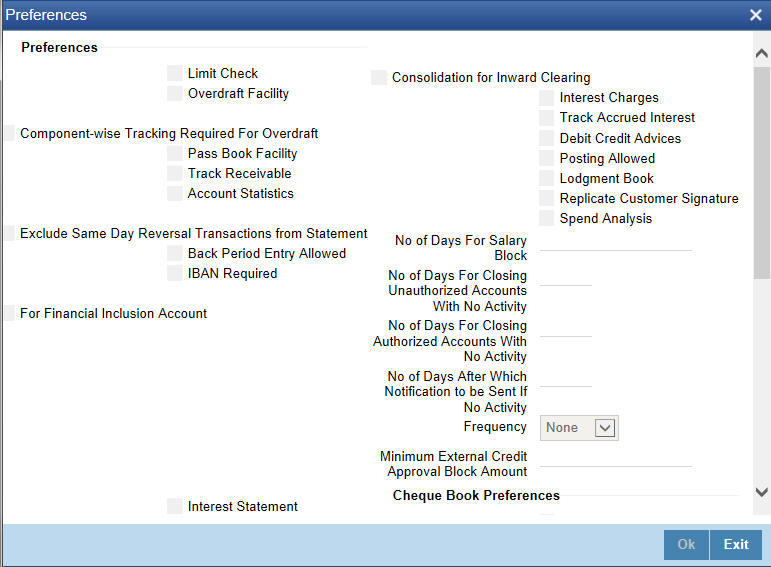 Indicating the preferences unique to an account class like the check book, passbook or ATM facilities to be given to account holders under this account class; whether overdraft facility should be allowed for accounts linked to this class; whether the credit limit should be checked for all accounts under the class; interest and charges to be computed for accounts under this class.