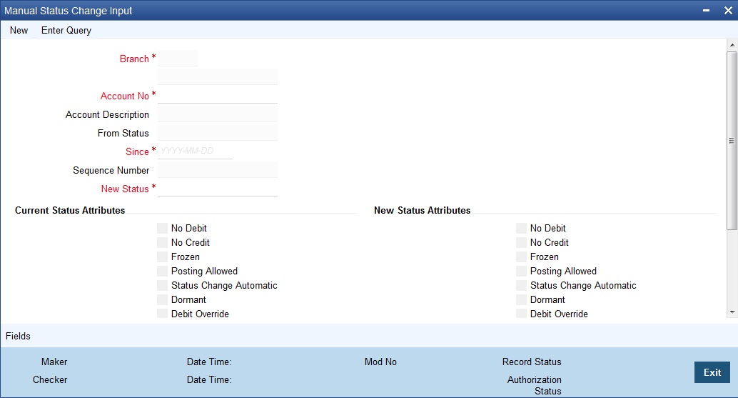 You can use the ‘Manual Status Change’ screen for status movements that have to be performed manually on a customer account. You can invoke this screen, by typing ‘STDSTCHN’ in the field at the top right corner of the Application tool bar and clicking the adjoining arrow button.