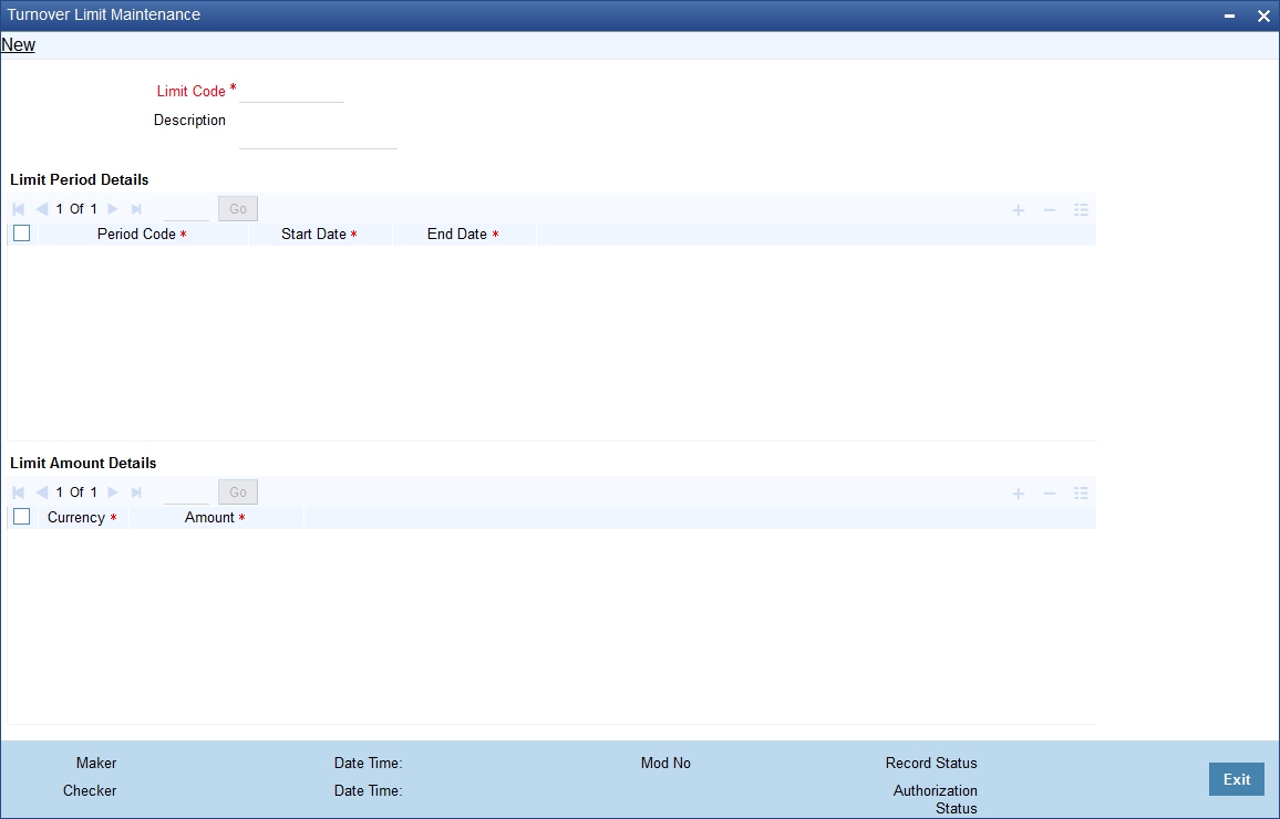 You can maintain turnover limits for a given period of time using the ‘Turnover Limit Maintenance’ screen. You can attach these limits to an account class and thereby track the turnover on all accounts under the account class.