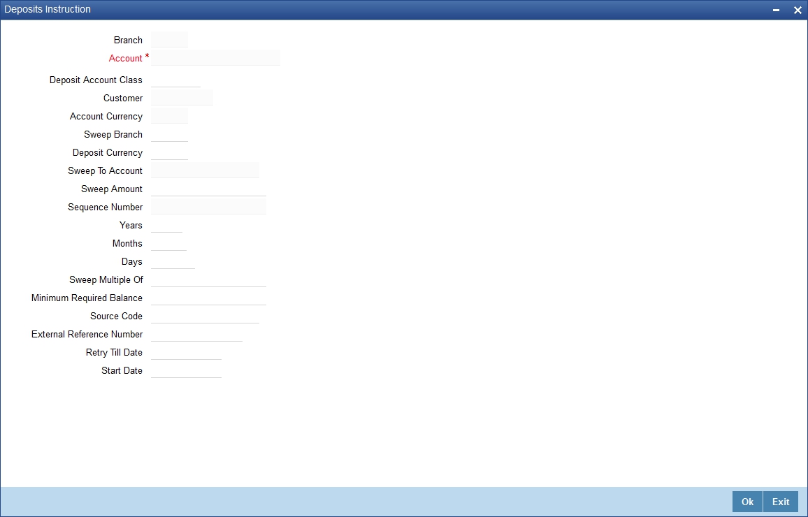 Specify the amount being deposited to open a customer account. While saving the record, the system checks whether this amount is equal to or greater than the minimum limit maintained for the linked account class. If the amount is less than the applicable limit, the system will display an error message. If it is equal to or greater than the limit amount, the system will proceed with saving.