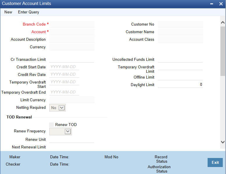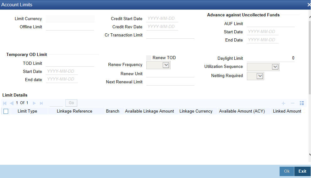 You can view this screen for maintaining the list of accounts for which the balance is to be netted. Additionally, TOD and a local facility can also be attached to this structure. The ‘limits check’ during accounting will look at the collective balance across all accounts.
