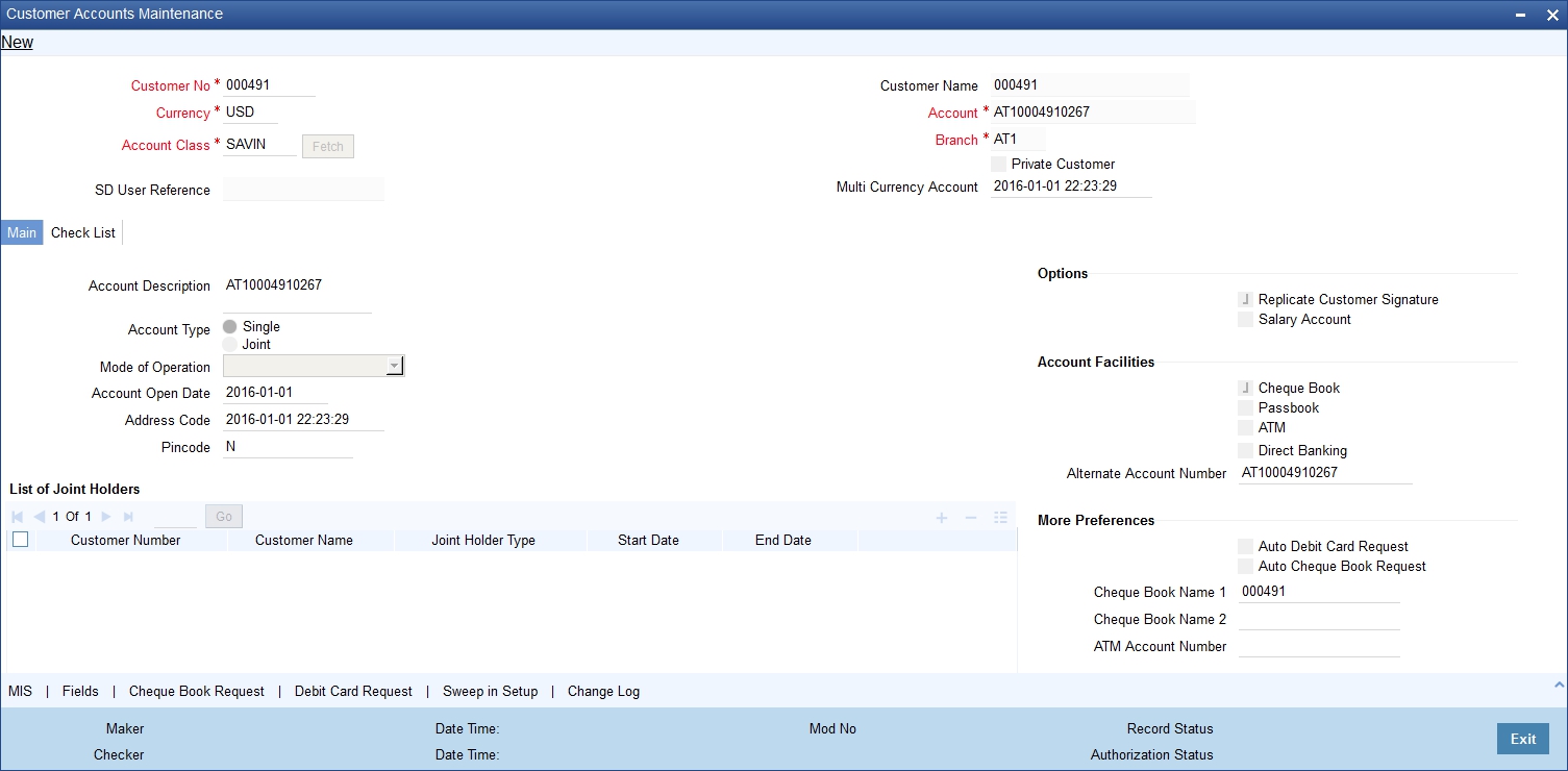 For an account number, you also need to define (in this screen) other parameters like: the account class; the type of account - joint or single; the reporting lines for the account; the currency in which transactions can be passed to this account; the customer’s account limit; the check book/passbook/ATM facility, the various statuses applicable to the account and so on.