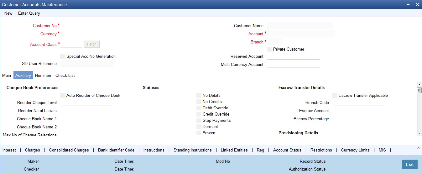 Here you maintain the main attributes of each customer account like the account number, customer code, the account class, account currency, type of account - single or joint, account status, other statuses applicable, Cheque Book preferences etc. |