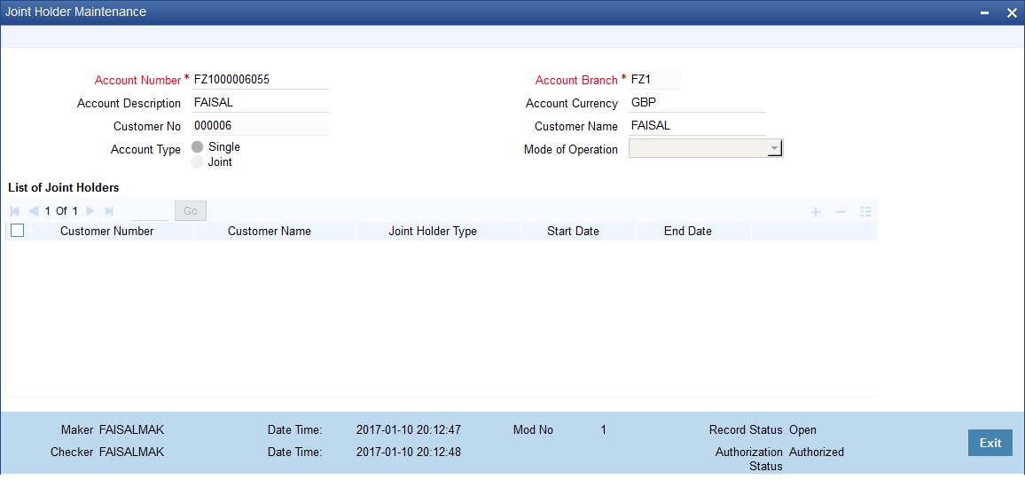 To view the joint holder’s details of an account and the mode of operation maintained at the account level, place the cursor on the Account field and press Ctrl+J. The system displays the ‘Joint Holder’ screen.