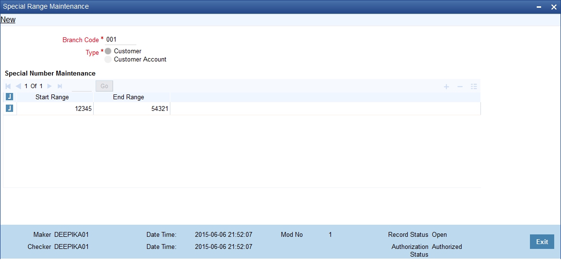 An example of maintaining branch wise CIF range for specific customers are as follows: