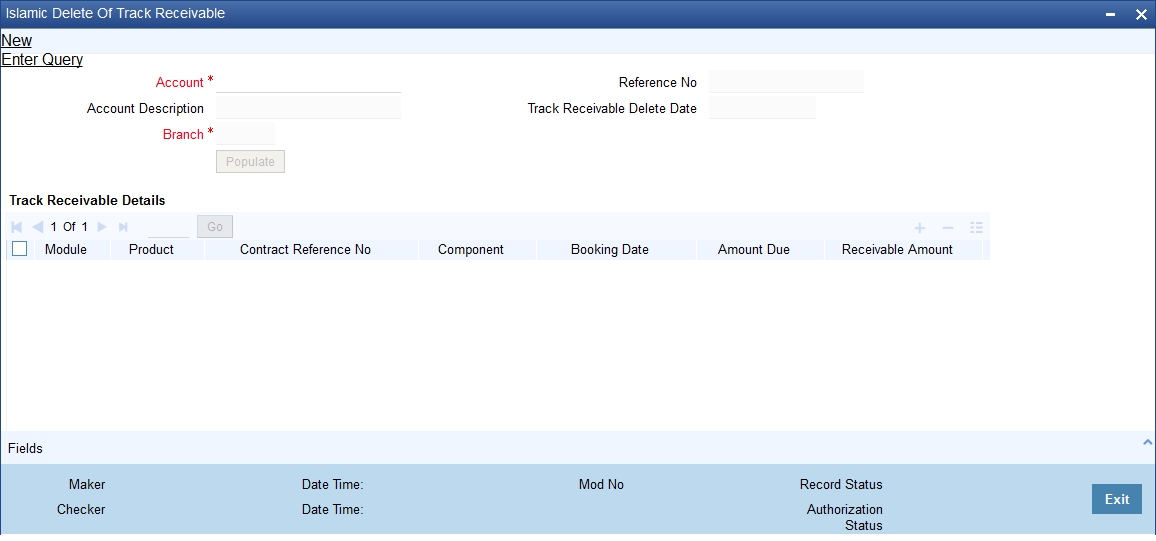 The Delete Track Receivable screen allows you to manually delete track receivable records. Delete Track Receivable is supported only for modules like ‘CL’, ‘CI’, ‘MO’ and ‘LE’. These modules will be modified to fetch records in RT, CG, DD, UP and IC modules. The first level of authorisation for deletion of Track Receivable must be done through STDTRKDL function ID..