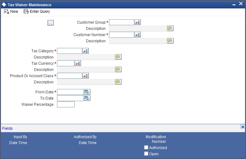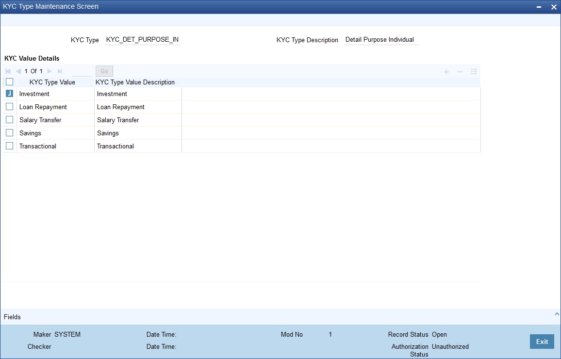 You can create user defined fields using the ‘User Defined Fields’ screen. To invoke this screen, click ‘Fields’ tab in the ‘KYC Maintenance’ screen.