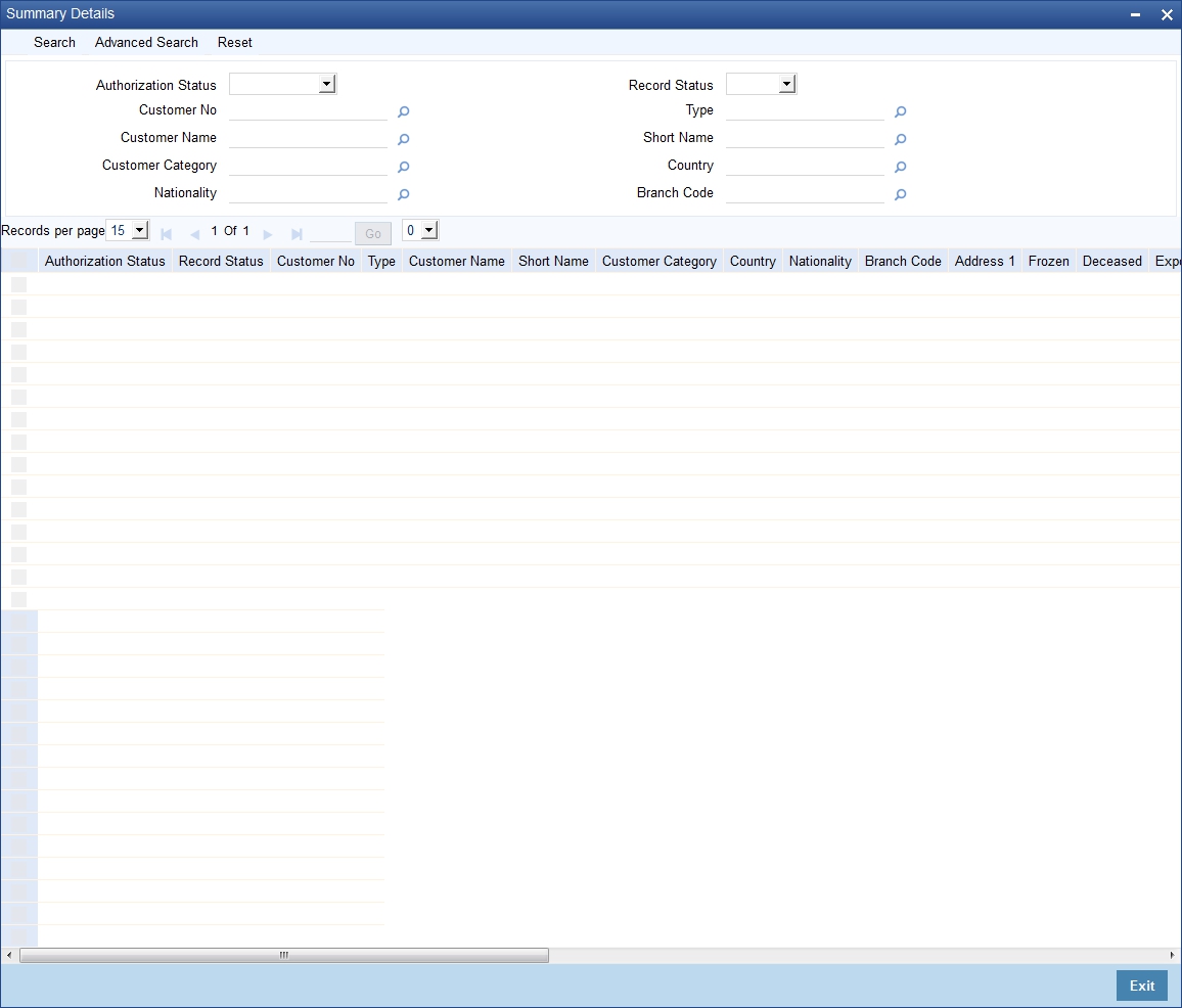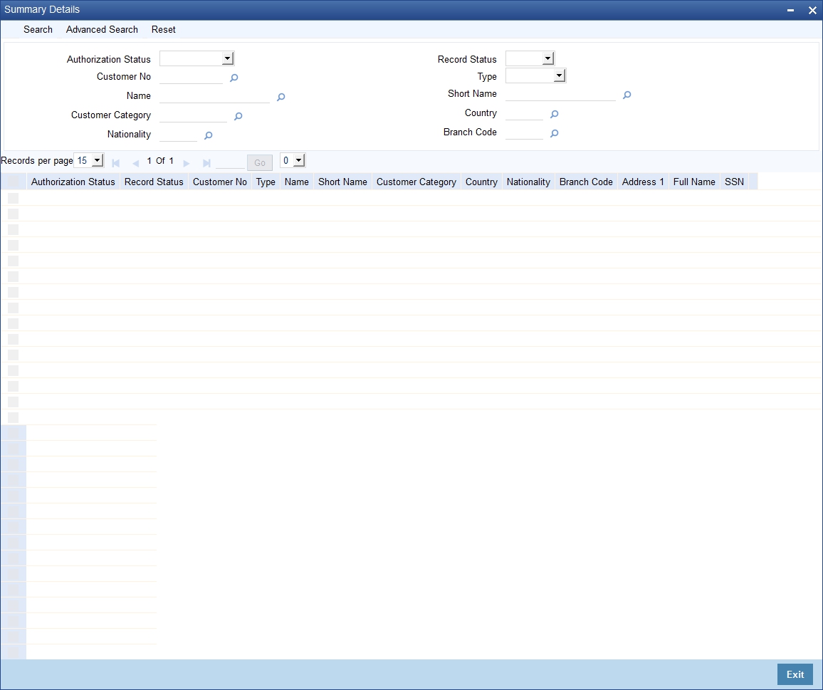 You can search the details of individual or corporate CRM customer or prospect customer in the ‘Customer Party Summer’ screen. To invoke this screen, type ‘STSCUSSH’ in the field at the top right corner of the Application tool bar and clicking the adjoining arrow button.