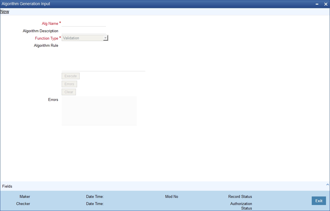 You must enter the algorithm rule in the form of PL/SQL code. After writing the PL/SQL code, click ‘Execute’ button to compile the code. The algorithm rule is validated by the system and the success or failure message is shown in the Error editor. Click ‘Errors’ button to view the errors.