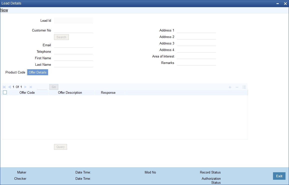 For more details on the Lead Input screen, refer the ‘Maintaining Lead Details’ section of this user manual.