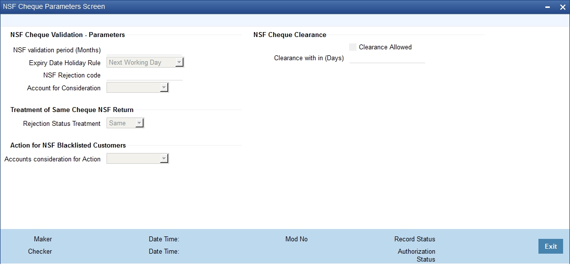 You can capture the NSF validation related parameters in the NSF Cheque parameters screen. You can invoke this screen by typing ‘STDNSFPR’ in the field at the top right corner of the Application tool bar and clicking the adjoining arrow button.