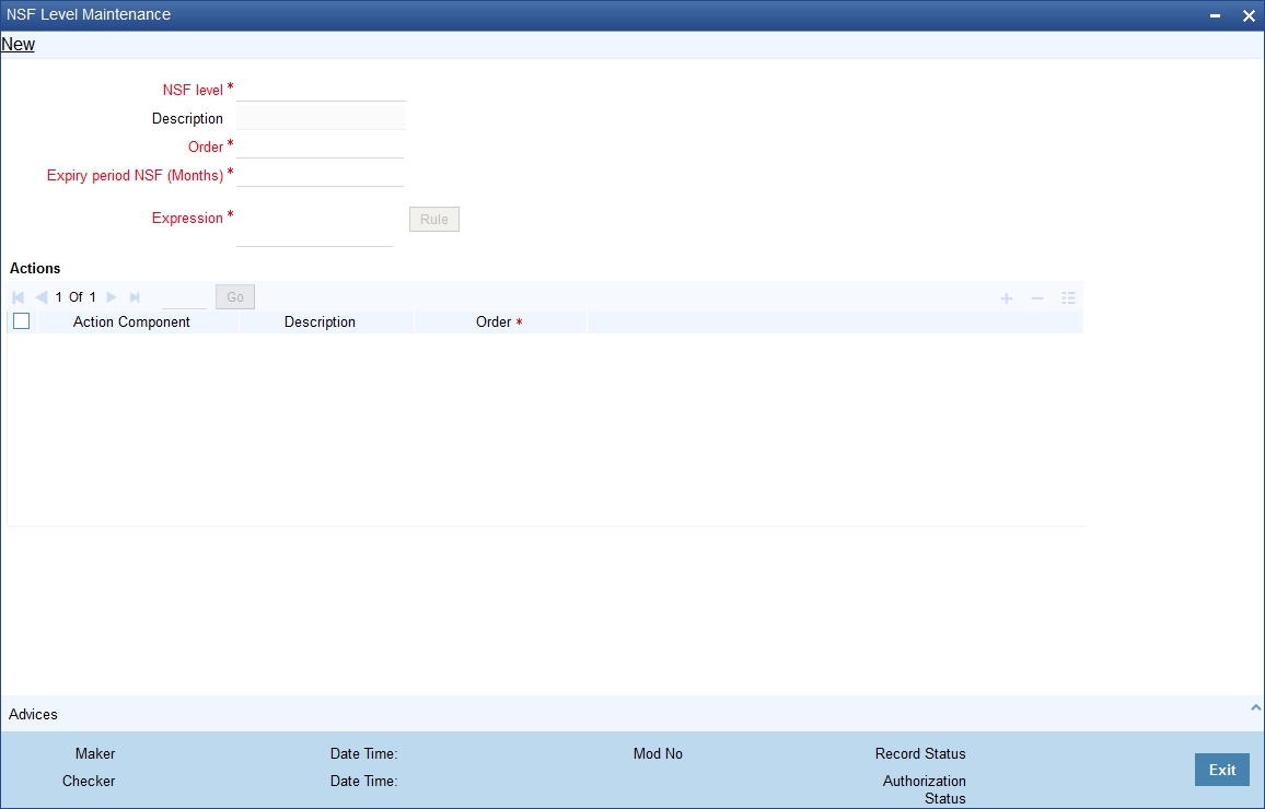 Oracle FLEXCUBE supports cheque processing through web branch screen and generic interface upload routine facility. You can maintain customised Non Sufficient Fund Cheque level and the components associated with NSF level in ‘NSF Level Maintenance’ screen.