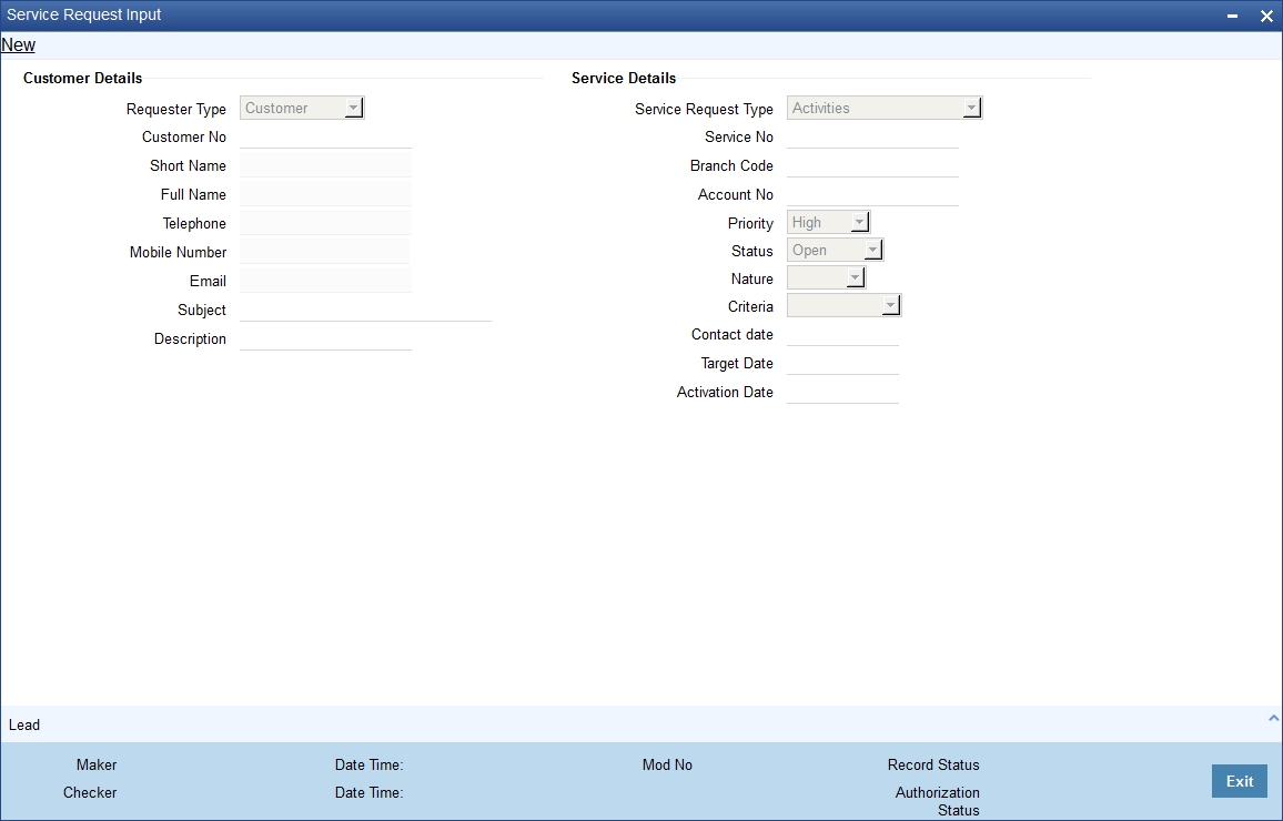 You can maintain the customer and non-customer’s request\complaints in the ‘Service Request Input’ screen. To invoke this screen, type ‘STDSRQST’ in the field at the top right corner of the Application tool bar and click the adjoining arrow button.
