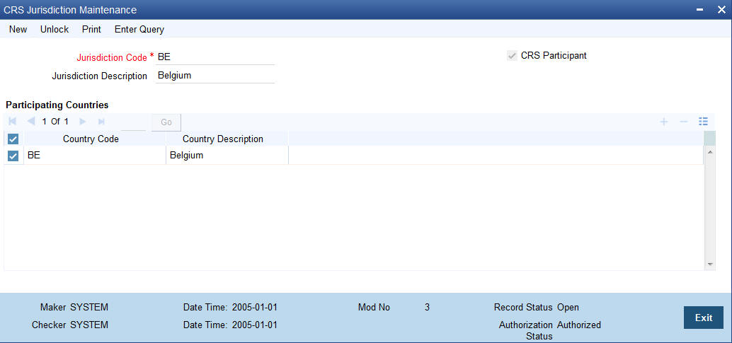 You can define jurisdictions and their participating countries using CRS Jurisdiction Maintenance screen. You can invoke this screen by typing ‘STDJSMNT’ in the field at the top right corner of the Application tool bar and clicking the adjoining arrow button.