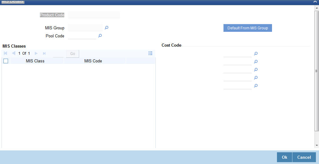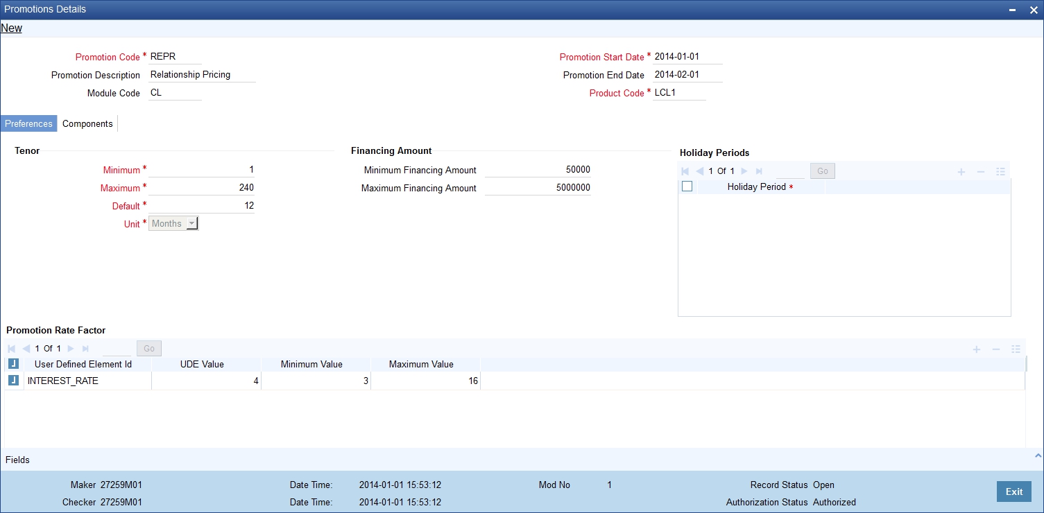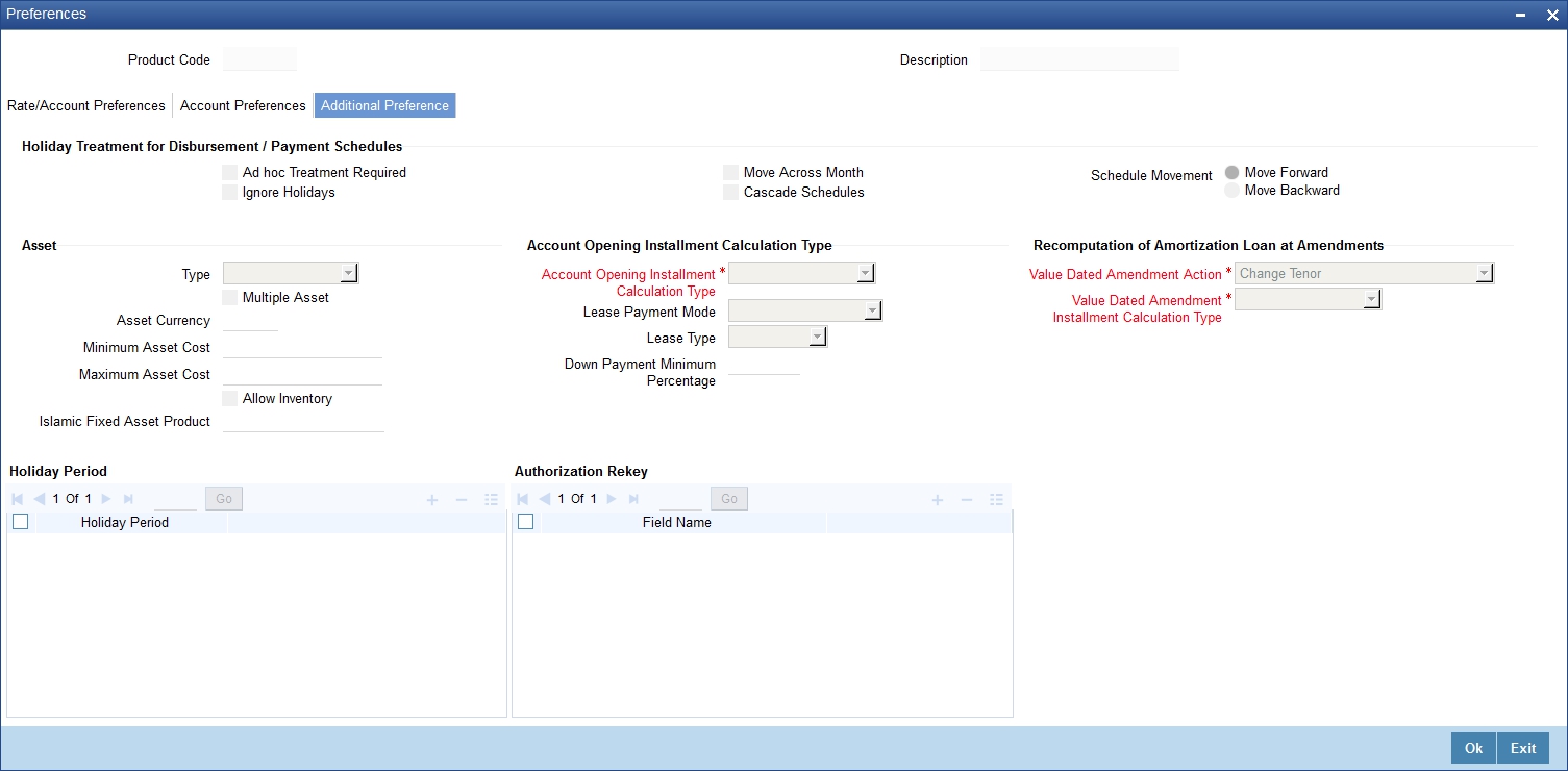 When you click on ‘OK’, the preferences maintained for the default product (the typical characteristics of a finance product) gets associated with the product being defined.