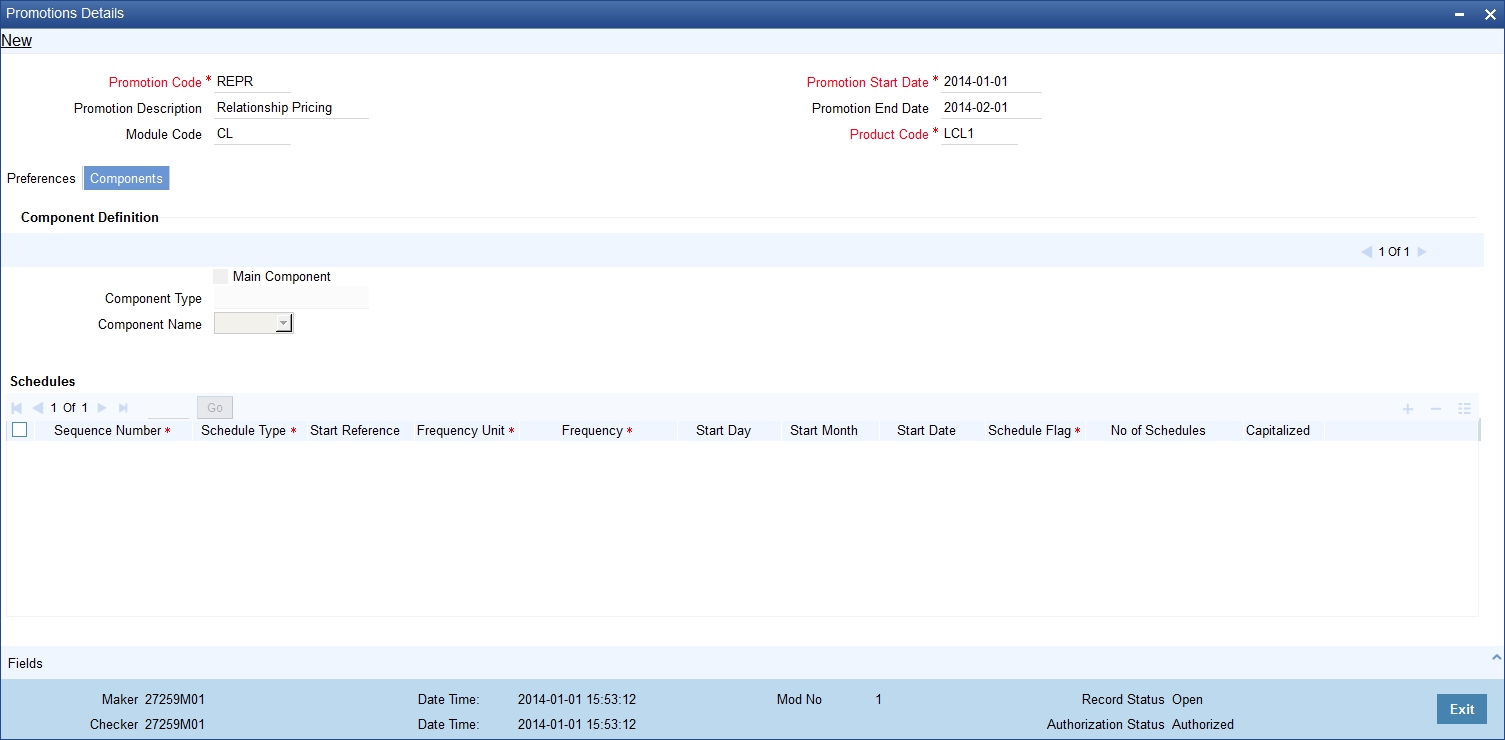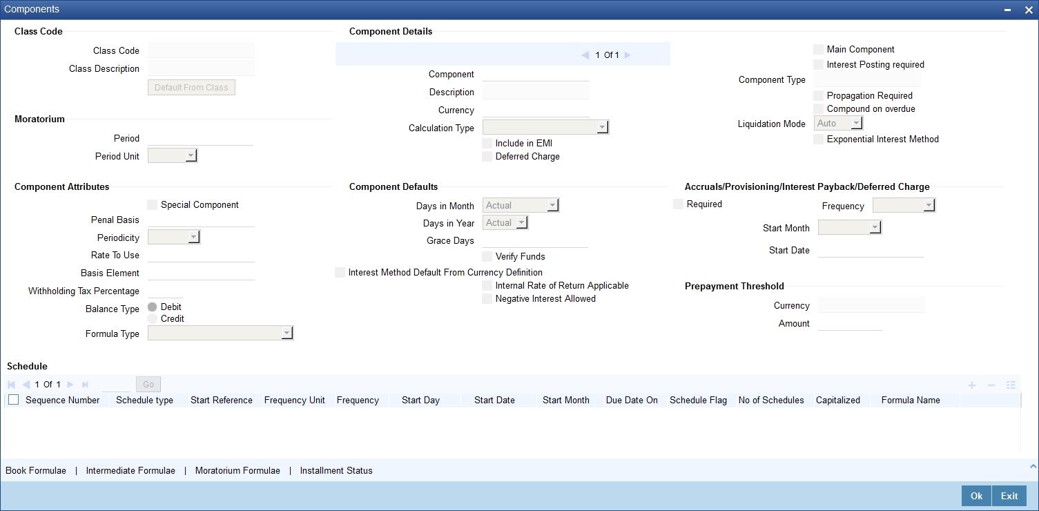 The component ‘PRINCIPAL’ will have default schedule types ‘Disbursement’ and ‘Payment’ and relevant details for these schedules.