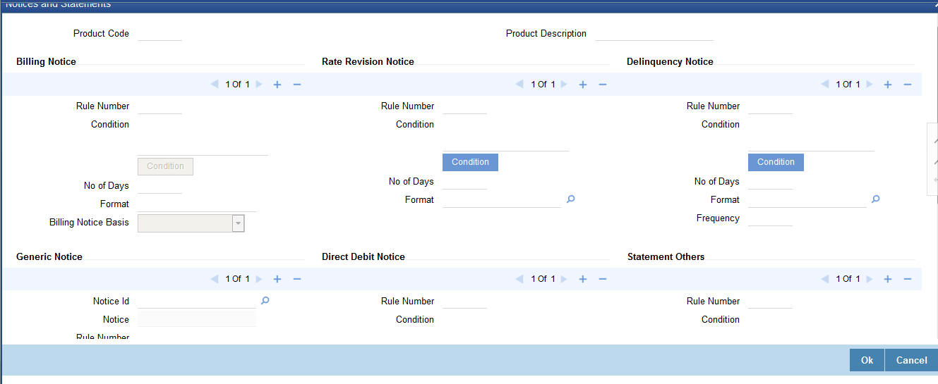 This button is used to specify details of account statements and notices to be issued to customers. These have to be generated for different events in the life cycle of a finance. |
