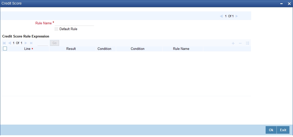 You have to specify the credit scoring rule for the product. Based on the information captured in the application, the customer’s credit scoring is done using the rule selected here. The list of rules available in the option list is factory shipped and you can choose a rule based on your requirement from this list.