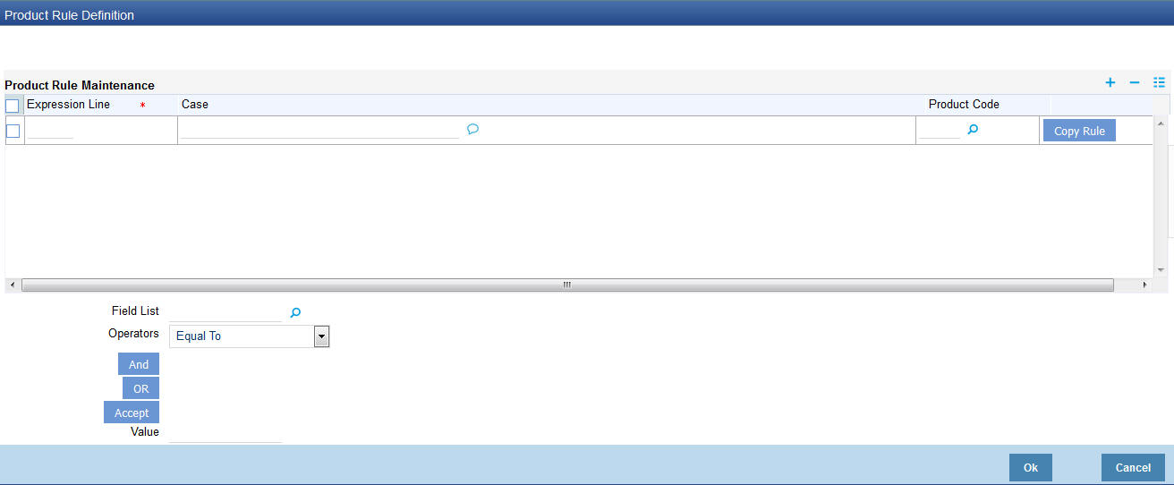 To create a rule, click ‘Product Rule’ button in the screen above. The ‘Product Rule Definition’ screen is displayed.