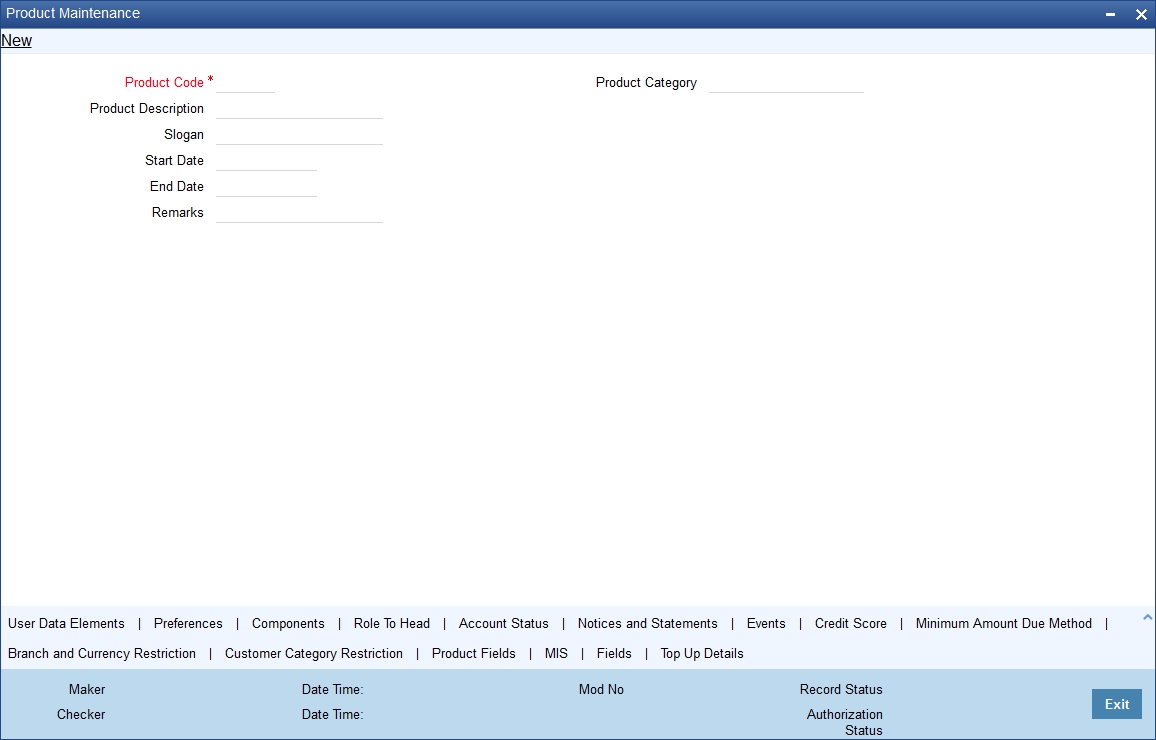 When defining a new product, you should enter a code. This code is unique across the Islamic Financing module of Oracle FLEXCUBE. For instance, if you have used VA01 for a product in this module, you cannot use it as a product code in any other module.