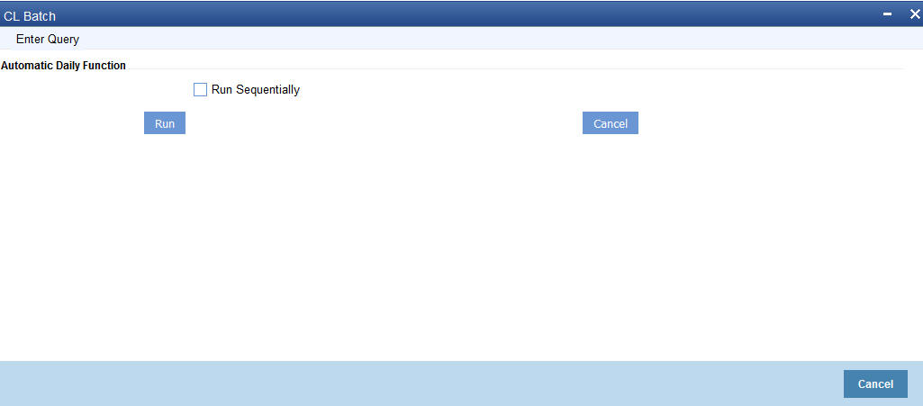 You also have the option to execute the batch programs through the ‘CL Batch’ screen. Note that you can process the transactions booked under the Retail lending module too using this batch process. You can invoke this screen by typing ‘CLDBATCH’ in the field at the top right corner of the Application tool bar and clicking the adjoining arrow button.