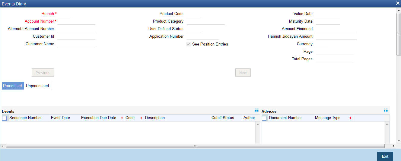 Refer the section ‘Events Diary’ in the chapter titled ‘Account Creation’ in this User Manual for details about the ‘Events Diary’ screen.