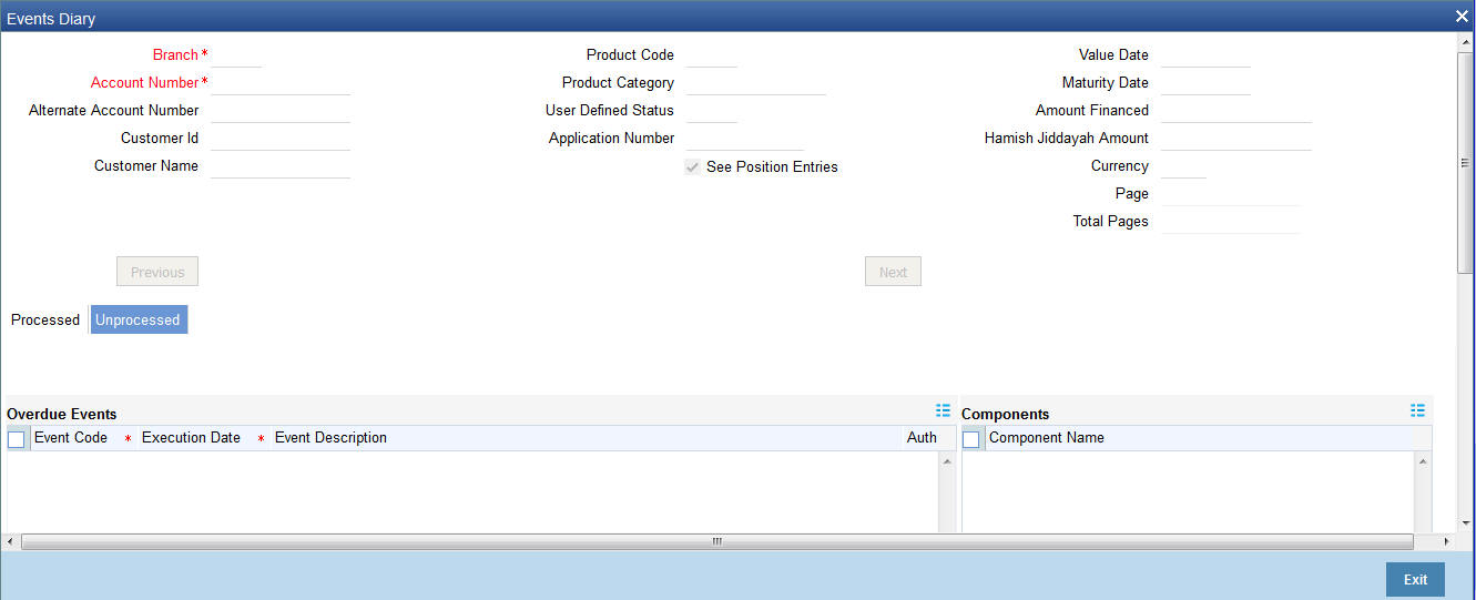 Click ‘Events’ button on the ‘CL User Defined Events Triggering’ screen and invoke the ‘Events Diary’ screen.