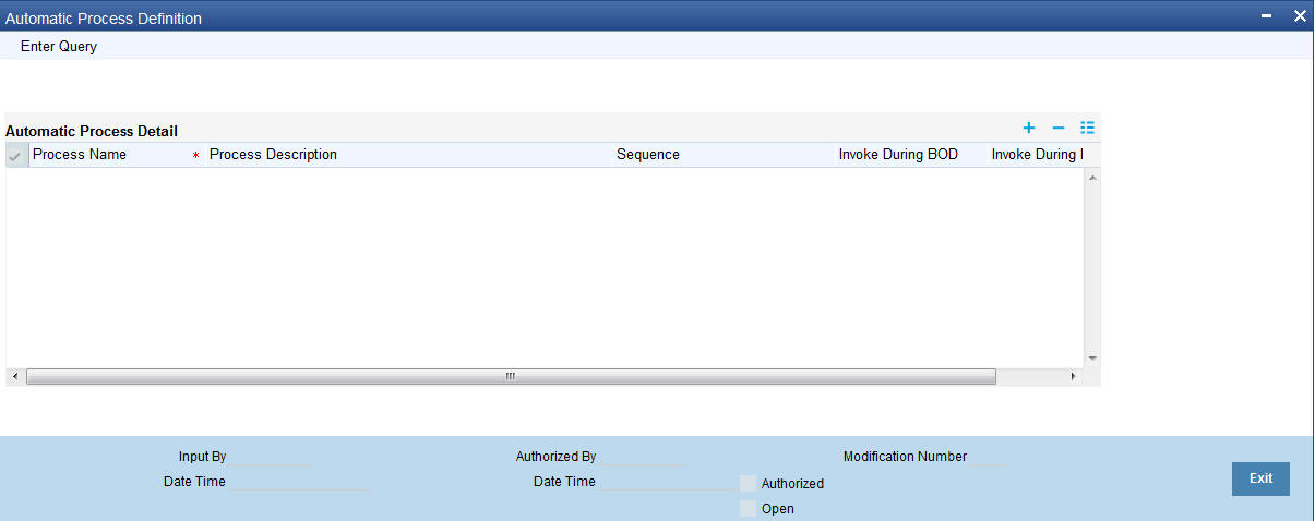You have the facility to configure the batch processes to be executed either at EOD or BOD or both, as per the bank’s requirement. This is achieved through the ‘Automatic Process Definition’ screen. You can invoke this screen by typing ‘CLDTPROC’ in the field at the top right corner of the Application tool bar and clicking the adjoining arrow button.