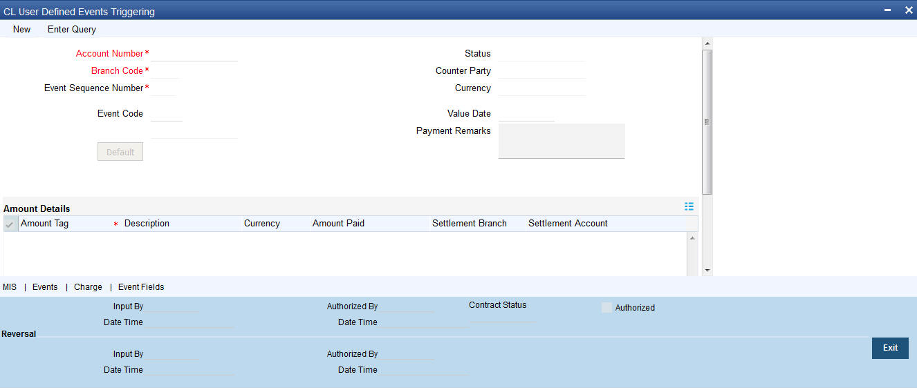 You can use the ‘CL User Defined Events Triggering’ screen to manually trigger the user defined events for Islamic Financing accounts. You can this screen by typing ‘UDDCLEVT’ in the field at the top right corner of the Application tool bar and clicking on the adjoining arrow button.