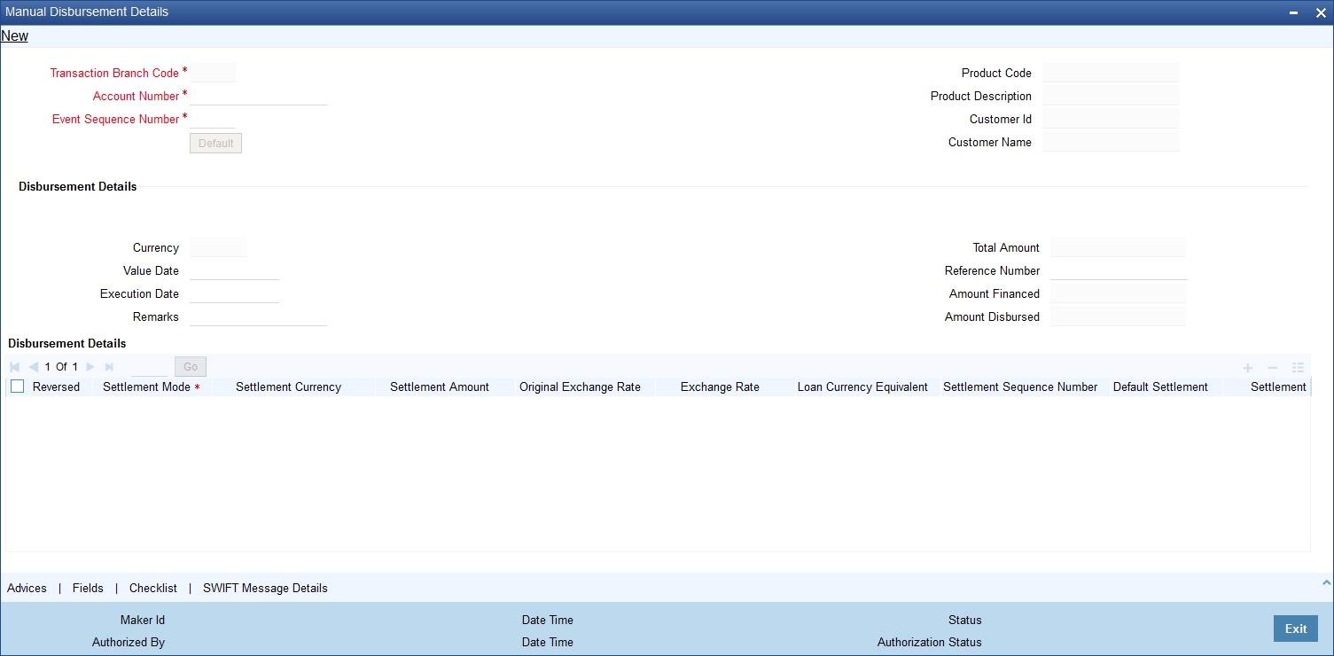 To begin the disbursement, click on the New icon in the toolbar of the screen. Enter the account number and click the ‘Default’ button. The system defaults the details based on product definition and the account maintained by the bank for the account. You can modify the relevant details.